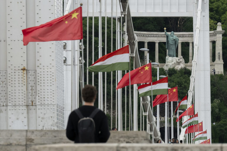 Muž stojí pod čínskou a maďarskou štátnou vlajkou umiestnenou na Alžbetinom moste v Budapešti. Foto: SITA/AP