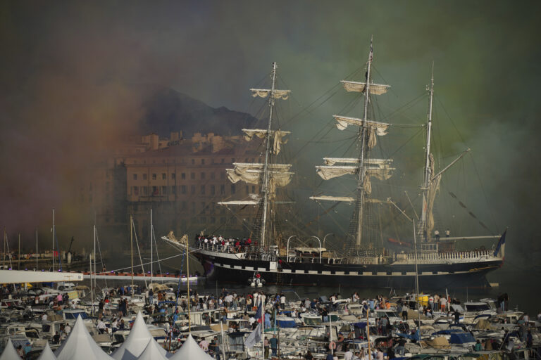 Belem, trojsťažňová plachetnica, ktorá nesie olympijský oheň z Grécka do Francúzska. Foto: SITA/AP.