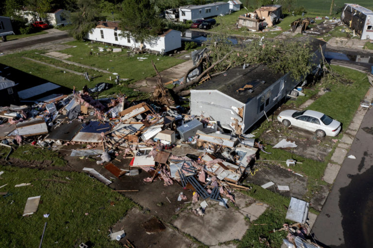 Tornádom poškodené mobilné domy v Michigane. Foto: Neil Blake/The Grand Rapids Press via AP.