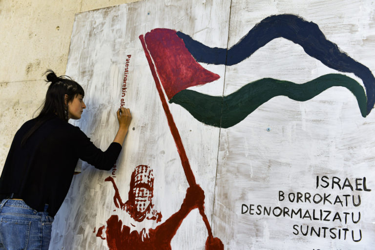 Študentka z Verejnej univerzity v Navarre v Španielsku maľuje nástennú maľbu vyzývajúcu na bojkot a zničenie štátu Izrael. Foto: SITA/AP.