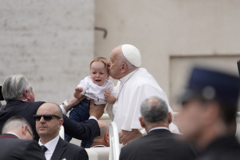 Pápež František pobozkal dieťa na konci svojej týždennej generálnej audiencie na Námestí svätého Petra vo Vatikáne. Foto: SITA/AP