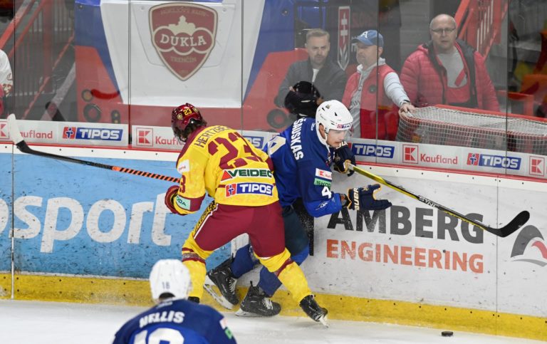 Zľava: Viktor Hertzberg z HK Dukla Trenčín a Nerijus Ališauskas z HK Spišská Nová Ves počas zápasu 8. kola Tipos extraligy 2023/2024. Foto: SITA/Tomáš Somr.
