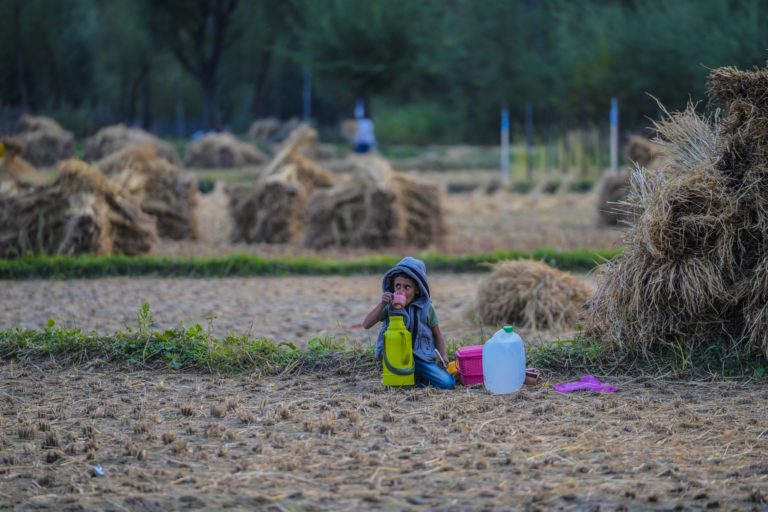 Chlapec pije čaj zatiaľ čo je rodičia pracujú na ryžovom poli na okraji Srinagaru v Kašmíre. Foto: SITA/AP.