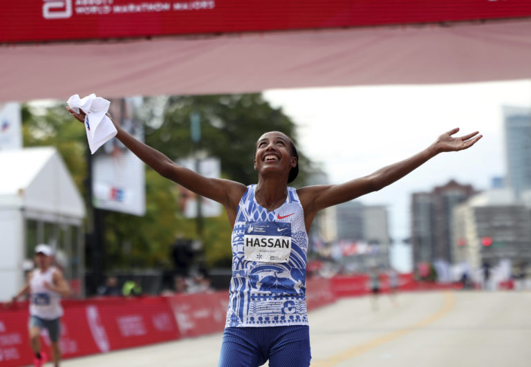 Sifan Hassan sa teší z triumfu na 45. ročníku Chicagského maratónu. Foto: Eileen T. Meslar /Chicago Tribune via AP.