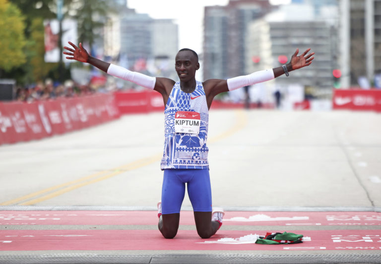 Kelvin Kiptum sa teší z triumfu na 45. ročníku Chicagského maratónu, vytvoril aj svetový rekord. Foto: Eileen T. Meslar /Chicago Tribune via AP.