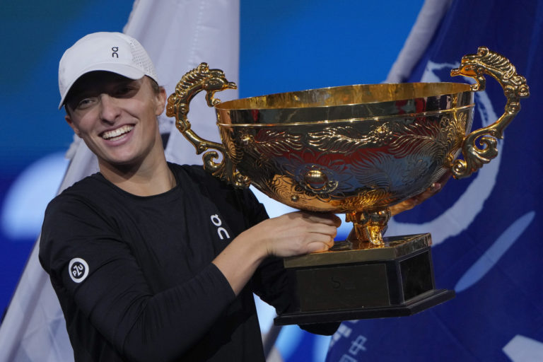 Poľská tenistka Iga Swiateková s víťaznou trofejou po finálovom zápase na turnaji v Pekingu, v ktorom zdolala Ludmilu Samsonovovú z Ruska dvakrát 6:2. Foto: SITA/AP.