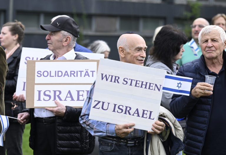 Zhromaždenie v Düsseldorfe na podporu Izraela, ktorý bojuje s Hamasom. Foto: Roberto Pfeil/dpa via AP.
