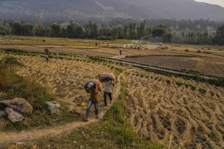 Kašmírski farmári pracujú na ryžovom poli na okraji Srinagaru. Foto: SITA/AP.