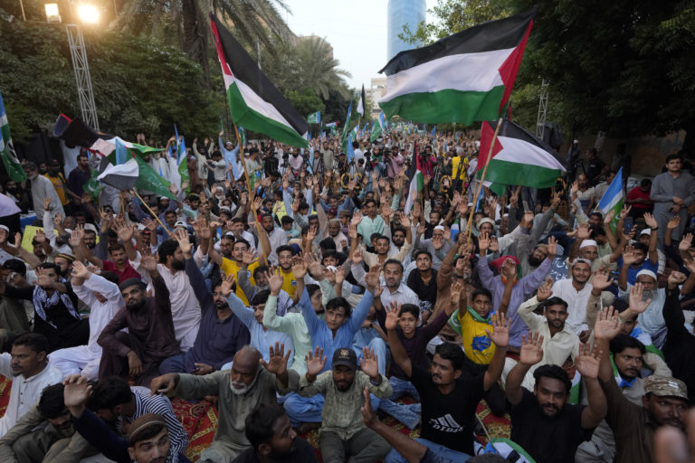Prívrženci Jamaat-e-Islami skandujú heslá proti izraelským náletom na Gazu počas demonštrácie na prejav solidarity s palestínskym ľudom v pakistanskom Karáči. Foto: SITA/AP.