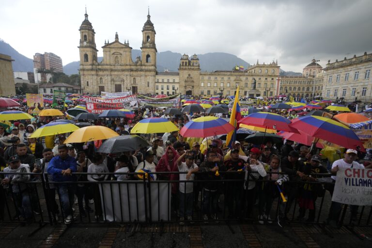 Chovatelia kohútov sa zhromažďujú na námestí Bolivar Plaza, aby protestovali proti navrhovanému zákonu, ktorý by zakázal kohútie zápasy v Bogote v Kolumbii v utorok 8. októbra 2024. Foto: SITA/AP