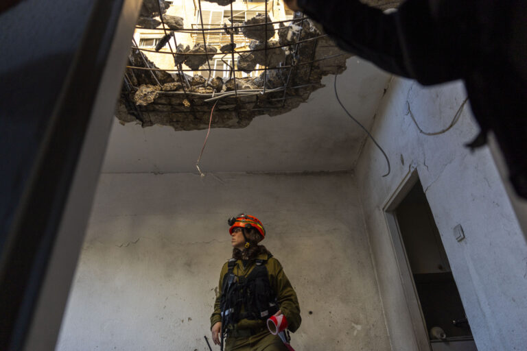 Dôstojník z vojenskej jednotky veliteľstva domáceho frontu skúma poškodený byt po tom, ako ho zasiahla raketa vypálená z Libanonu v Kirjat Jame na severe Izraela v utorok 8. októbra 2024. Foto: SITA/AP