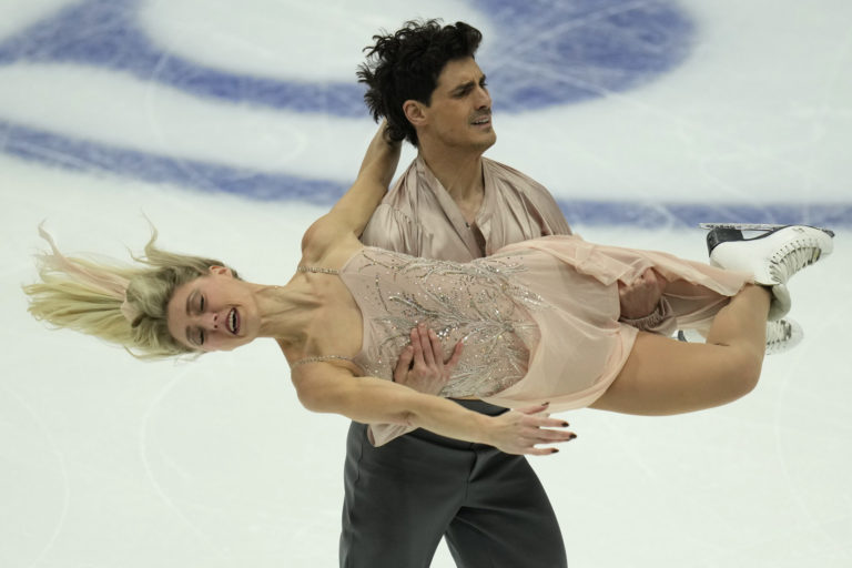 Bronzoví medailisti z Kanady Piper Gillesová a Paul Poirier súťažia vo finále Ice Dance v krasokorčuľovaní v Pekingu. Foto: SITA/AP.