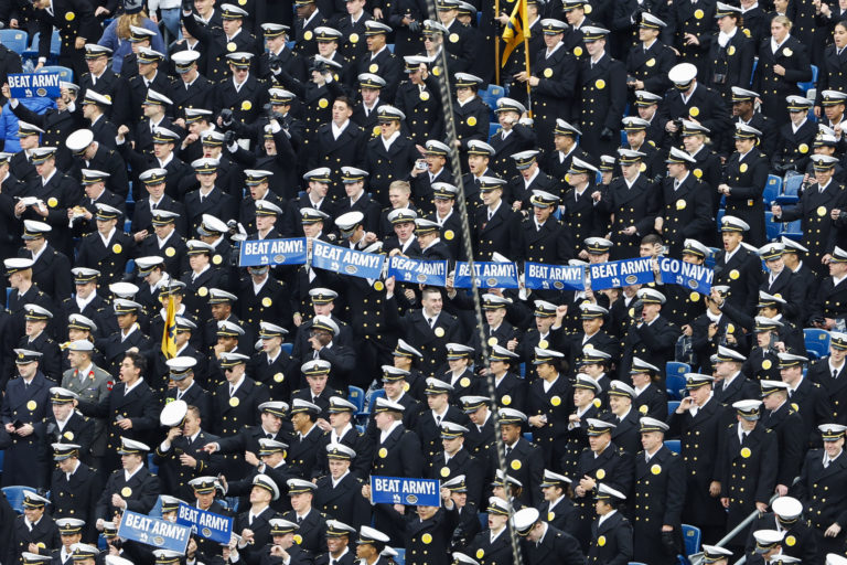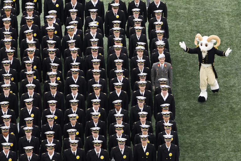 Členovia armády stoja na štadióne pred začiatkom zápasu amerického futbalu NCAA medzi Navy Midshipmen a Army Black Knights. Foto: SITA/AP.