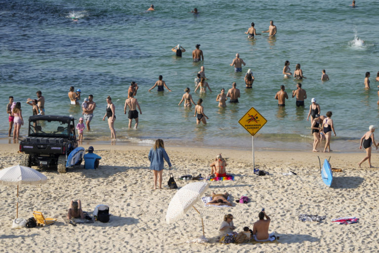 Ľudia plávajú v mori na pláži Bondi v Sydney, keďže sa očakáva, že teploty presiahnu 40 stupňov Celzia. Tamojší meteorológovia vydali výstrahy pred extrémnymi horúčavami. Foto: SITA/AP.