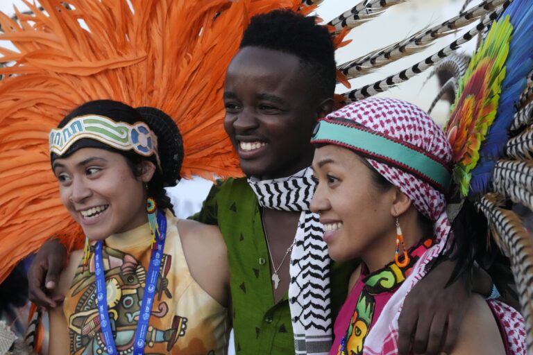 Geoffrey Mboya (uprostred) pózuje po demonštrácii za klimatickú spravodlivosť na klimatickom samite OSN COP28, ktorý sa koná v Dubaji. Foto: SITA/AP.