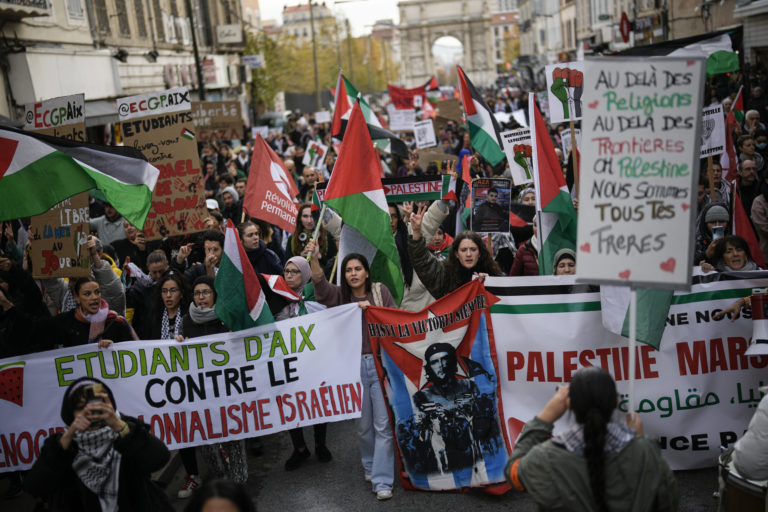 Demonštranti pochodujú počas propalestínskeho zhromaždenia vo francúzskom Marseille. Foto: SITA/AP.