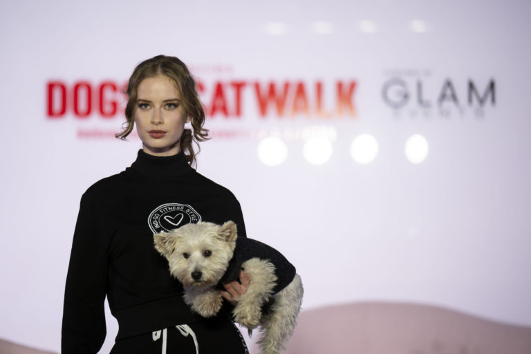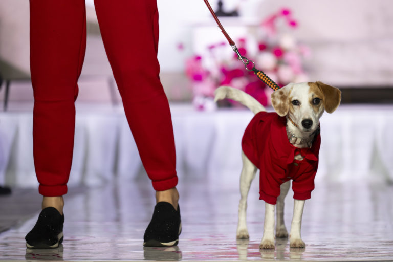 Modelka so psom z útulku kráča po prehliadkovom móle v Budapešti. Módni návrhári usporiadali prehliadku psej módy v snahe nájsť pre zvieratá milujúci domov. Foto: SITA/AP.