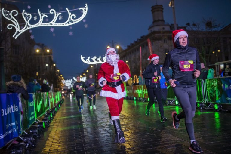 Bežci, niektorí sú oblečení v kostýmoch Santa Clausa, bežia počas tradičného vianočného behu po ulici vo Vilniuse v Litve. Foto: SITA/AP.