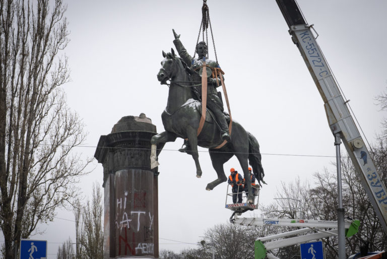 V ukrajinskom hlavnom meste Kyjev začali demontovať pamätník veliteľa Červenej armády Mykolu Ščorsa. Ščors bol ukrajinský komunista, ktorý bojoval na strane sovietskej Červenej armády počas ukrajinskej vojny za nezávislosť v roku 1917. Je známy tým, že velil jednotkám bojujúcim proti krátkotrvajúcej Ukrajinskej ľudovej republike vyhlásenej v novembri 1917. Foto: SITA/AP.