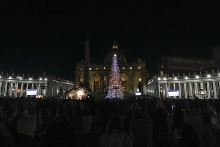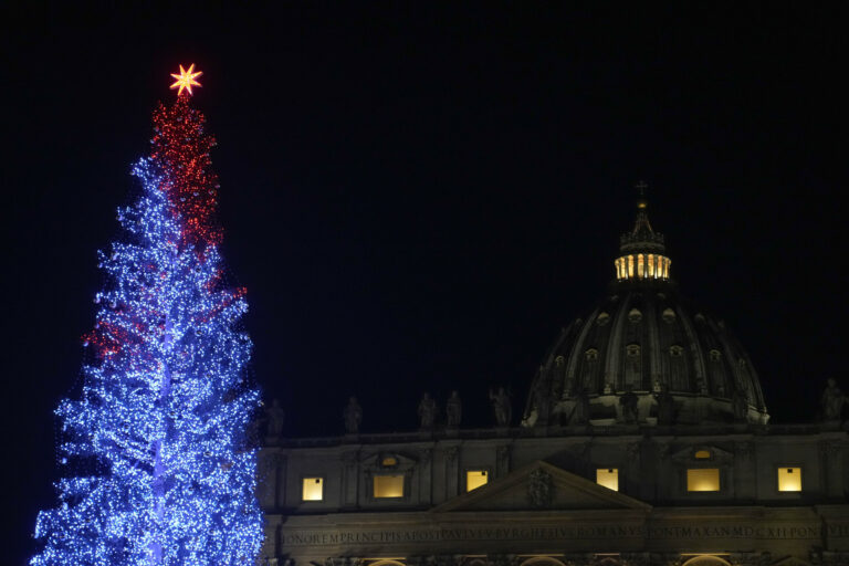 Pohľad na Baziliku sv. Petra po slávnostnom rozsvietení vianočného stromčeka a Betlehemu vo Vatikáne. Foto: SITA/AP.