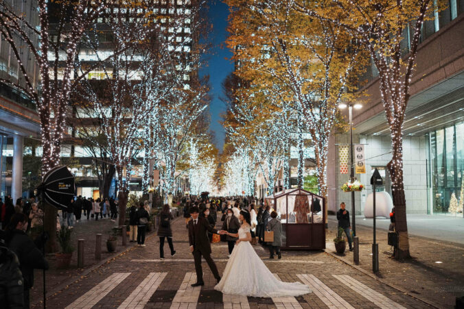Ľudia prechádzajúci ulicou Marunouchi Naka-dori v Tokiu, ktorá je osvetlená zimnými svetlami. Japonsko, 10. decembra 2025. Foto: AP Photo/Eugene Hoshiko