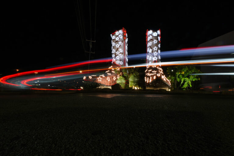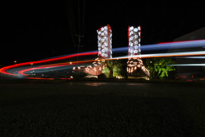 Vozidlá prechádzajú okolo páru kovbojských čižiem vysokých 12 metrov a dlhých 9 metrov v San Antoniu, ktoré boli na sviatky vyzdobené svetielkami. Texas, 10. december 2025. Foto: AP Photo/Eric Gay
