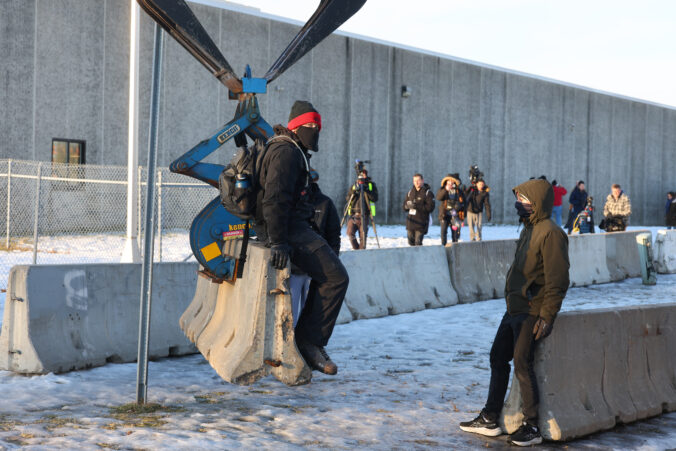 Protestujúci sedia na bariére, ktorá sa montuje pred federálnou budovou biskupa Henryho Whipplea počas protestu v Minneapolise. Minnesota, 9. januára 2026. Foto: AP Photo/Adam Bettcher