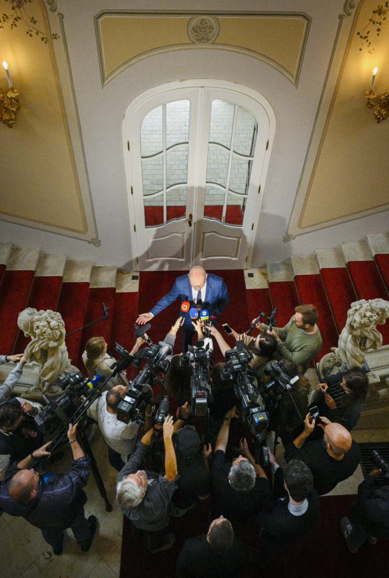 Predseda strany Sloboda a Solidarita (SaS) Richard Sulík (hore) počas brífingu s novinármi po prijatí v Prezidentskom paláci po predčasných voľbách do Národnej rady SR. Bratislava, 9. október 2023. Foto: SITA/Milan Illík.