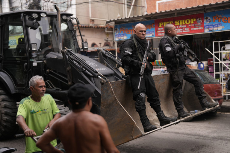 Policajti rozrážajú barikády počas bezpečnostnej operácie proti organizovanému zločinu v Rio de Janeiro. Foto: SITA/AP.