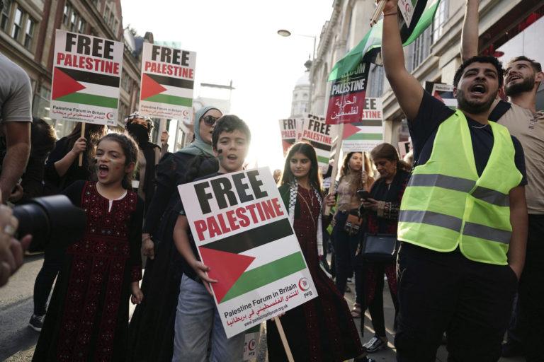 Demonštrácia za solidaritu s Palestínou blízko izraelského veľvyslanectva v Londýne. Foto: Jordan Pettitt/PA via AP.