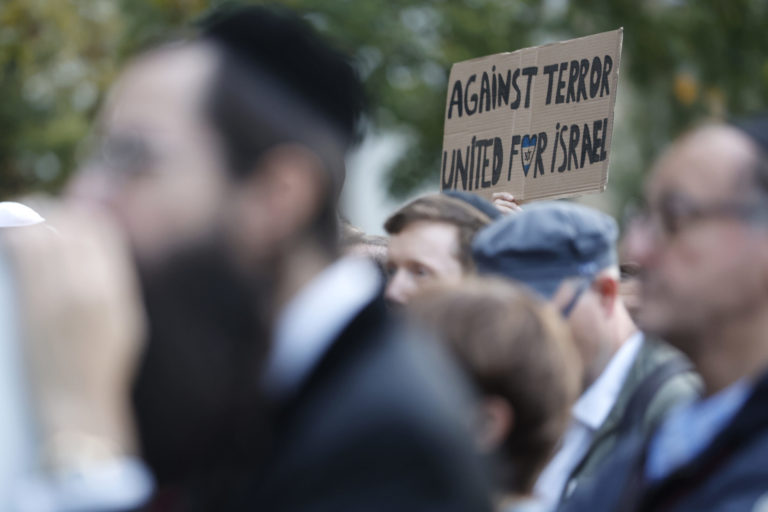 Zhromaždenie na podporu Izraela pred budovou Európskej rady v Štrasburgu. Foto: SITA/AP.