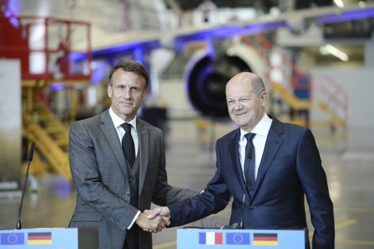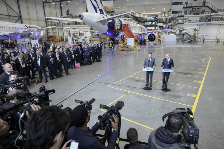 Francúzsky prezident Emmanuel Macron a nemecký kancelár Olaf Scholz na tlačovej konferencii vo výrobnej hale Airbusu v Hamburgu. Foto: Kay Nietfeld/dpa via AP.