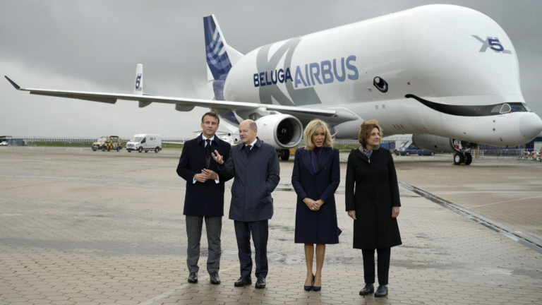Francúzsky prezident Emmanuel Macron a nemecký kancelár Olaf Scholz s manželkami pred nákladným lietadlom Airbus Beluga vo výrobnom závode Airbusu v Hamburgu. Foto: SITA/AP.