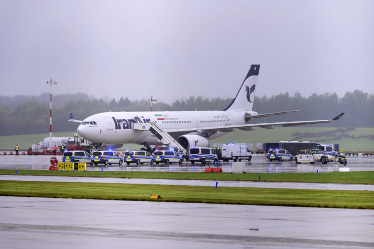 Policejné autá stoja pred lietadlom Iran Air na letisku v Hamburgu, v ktorom bol nahlásený poplach pre nešpecifikovanú hrozbu. Foto: Jonas Walzberg/dpa via AP.