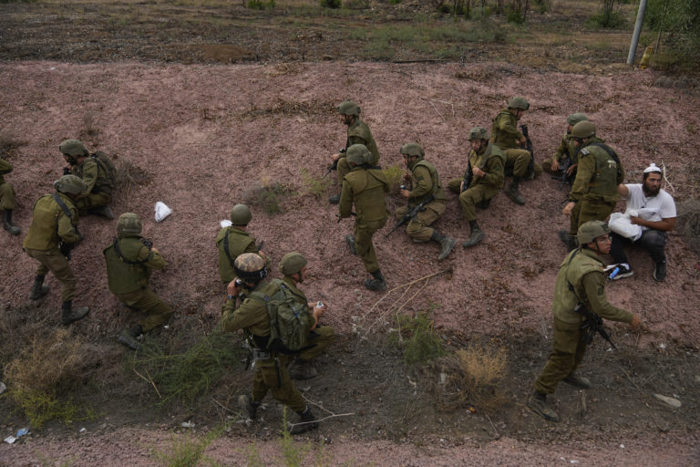 Izraelskí vojaci a civilisti sa ukrývajú, keď zaznie siréna varujúca pred prichádzajúcimi raketami vystrelenými z Pásma Gazy. Foto: SITA/AP.