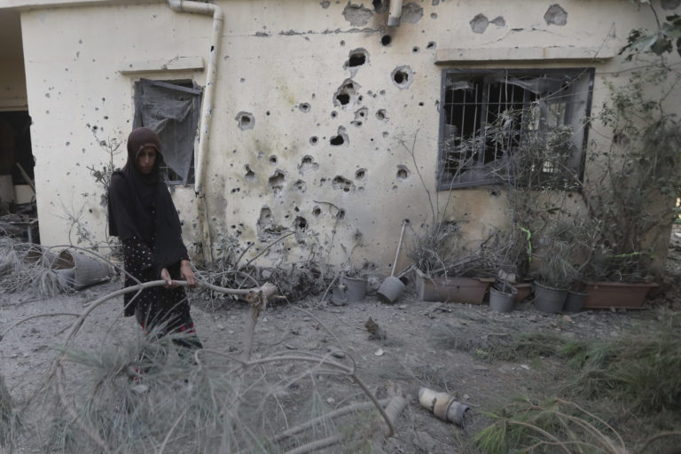 Žena odstraňuje zlomené vetvy stromu po tom, čo bol jej dom v dedine Dahaira na juhu Libanonu zasiahnutý izraelským ostreľovaním. Foto: SITA/AP.