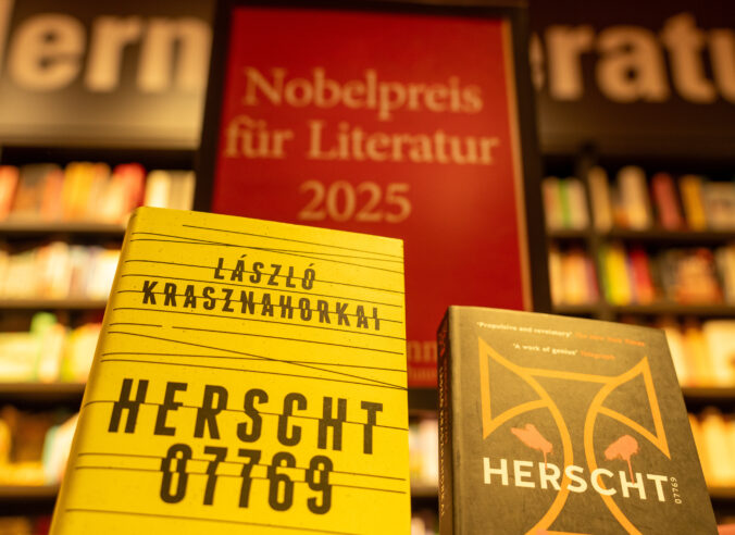 Knihy maďarského spisovateľa Lászla Krasznahorkaiho, vystavené pred stánkom s nápisom „Nobelova cena za literatúru 2025“ v berlínskom kultúrnom obchodnom dome Dussmann v Berlíne. Nemecko, 9. októbra 2025. Foto: (Soeren Stache/dpa via AP)