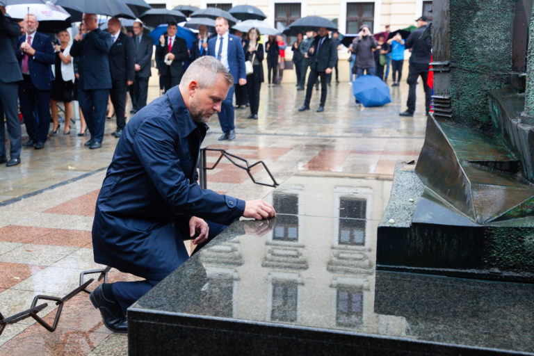 Prezident SR Peter Pellegrini (v popredí) počas pietneho aktu pri príležitosti Dňa obetí holokaustu a rasového násilia pri pamätníku holokaustu na Rybnom námestí v Bratislave. Bratislava, 9. september 2024. Foto: SITA/Bokor Tomáš
