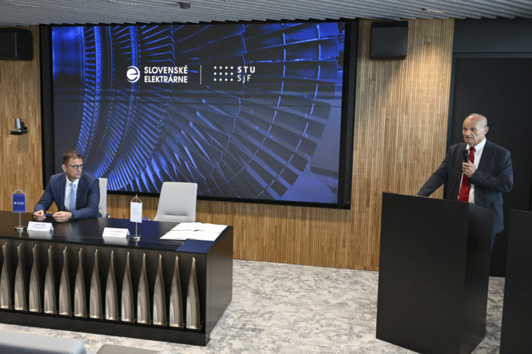 Zľava: Generálny riaditeľ Slovenských elektrární (SE) Branislav Strýček a dekan Strojníckej fakulty Slovenskej technickej univerzity (STU) Ľubomír Šooš počas podpisu Memoranda o spolupráci medzi Strojníckou fakultou Slovenskej technickej univerzity (STU) a Slovenskými elektrárňami (SE) v auditóriu Slovenských elektrární. Bratislava, 9. september 2024. Foto: SITA/Milan Illík