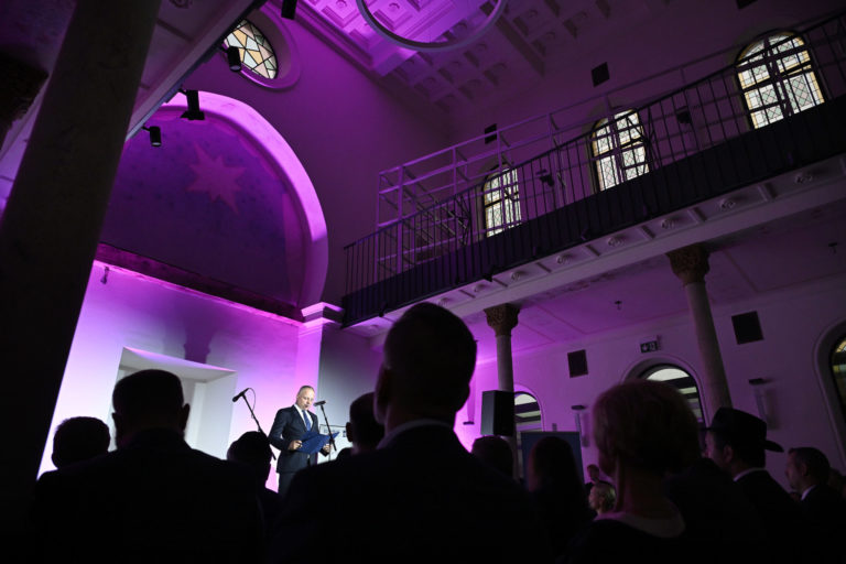 Bratislavský župan Juraj Droba (v pozadí) počas otvorenia Synagógy v Senci v rámci festivalu židovskej kultúry Shalom Chaverim. Senec, 9. september 2024. Foto: SITA/Milan Illík