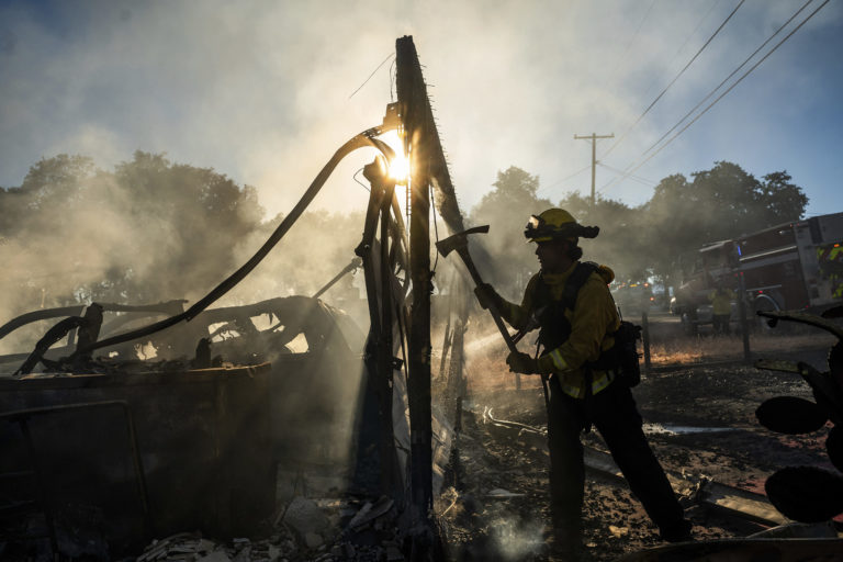 Hasič odstraňuje tlejúce kusy dreva po lesnom požiari v Kalifornii. Clearlake, 9. september 2024. Foto: SITA/AP