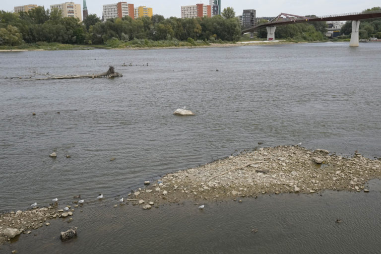 Dno poľskej rieky Visla viditeľné v dôsledku sucha spôsobeného týždňami horúčav a bez dažďa. Varšava, 9. september 2024. Foto: SITA/AP