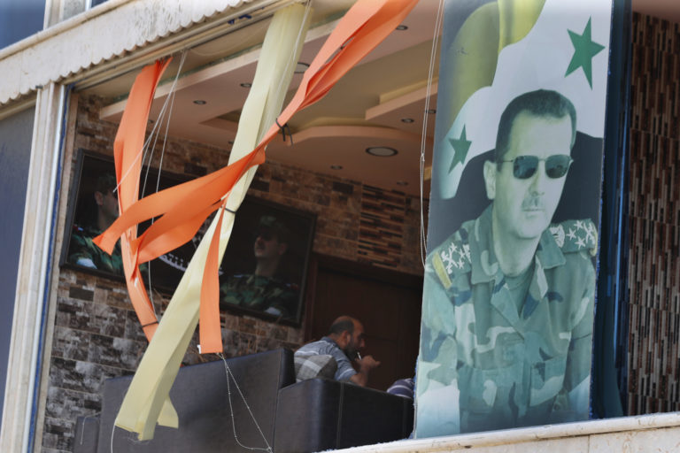 Plagát so sýrskym prezidentom Bašárom Asadom na rozbitom okne po izraelskom útoku. Masyaf, 9. september 2024. Foto: SITA/AP