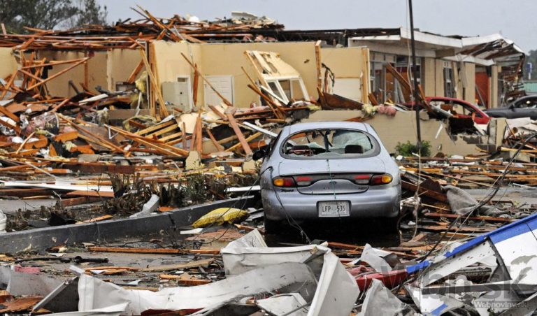 Spojené štáty už druhý deň sužujú ničivé tornáda. Od nedele si vyžiadali najmenej 21 obetí. Živel v nedeľu zasiahol najmä štáty Arkansas a Ohio, v pondelok pustošil v Mississippi v meste Tupelo, kde tornádo zničilo stovky budov, zhadzovalo drôty elektrického vedenia a stromy. Búrkový systém sa presunul v utorok do štátu Alabama. Z karavanového kempu neďaleko mesta Athens už hlásia prvé obete. Ohrozené sú aj časti štátov Georgia a Tennessee. Foto: SITA, AP - Tupelo v štáte Mississippi -