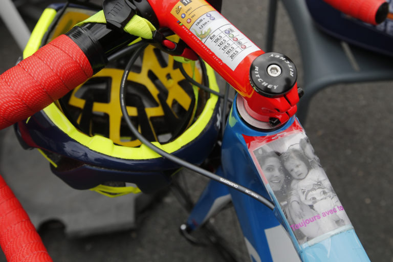 Bicykel francúzskeho jazdca Yoanna Offreda zdobí fotografia jeho ženy a detí s textom: "Navždy s tebou". Foto: SITA/AP