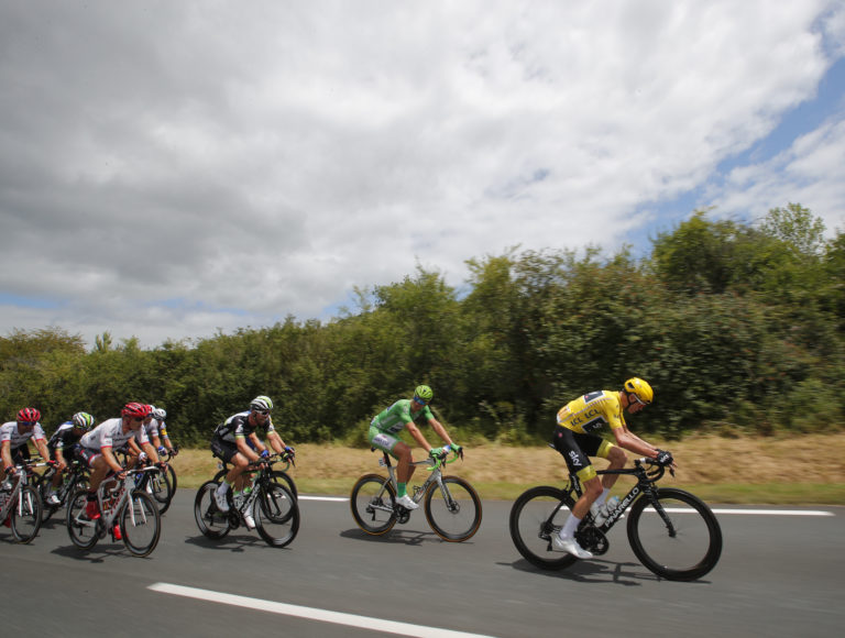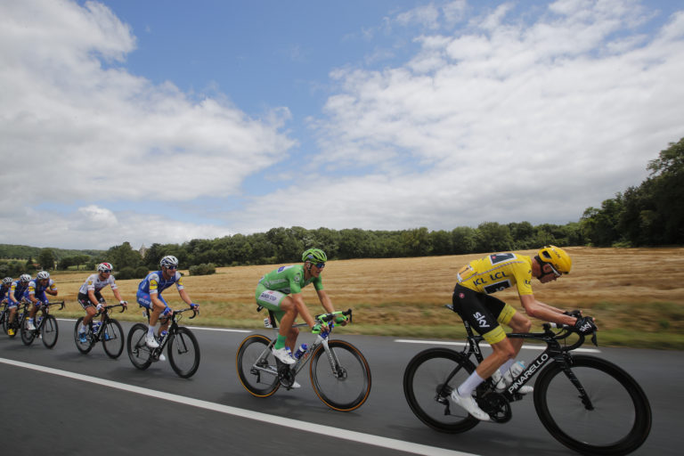 Brit Chris Froome, oblečený vo vedúcom žltom drese a Nemec Marcel Kittel,oblečeny v zelenom drese najlepšieho šprintéra počas 11. etapy Tour de France. Foto: SITA/AP