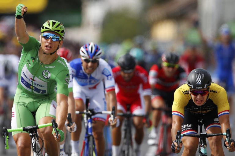 Nemec Marcel Kittel, oblečený v zelenom drese najlepšieho šprintéra prekročil víťaznú pásku 11. etapy Tour de France 2017. Foto: SITA/AP
