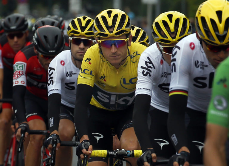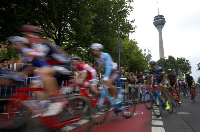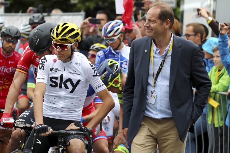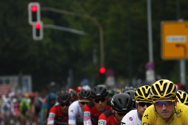 Britský cyklista Christopher Froome pred druhou etapou 104. ročníka Tour de France, ktorá viedla z Düsseldorfu do Liége. Düsseldorf, 2. júl 2017. Foto: Daniel Karmann/dpa via AP.