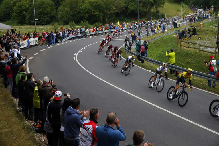 Atmosféra pri trati počas druhej etapy 104. ročníka Tour de France, ktorá viedla z Düsseldorfu do Liége. Foto: Friso Gentsch/dpa via AP.