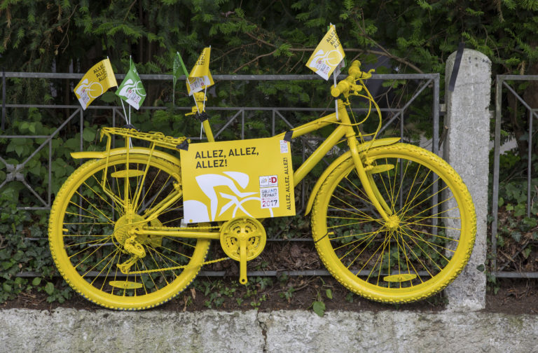 Britský cyklista Geraint Thomas (v žltom) pred druhou etapou 104. ročníka Tour de France, ktorá viedla z Düsseldorfu do Liége. Foto: SITA/AP.